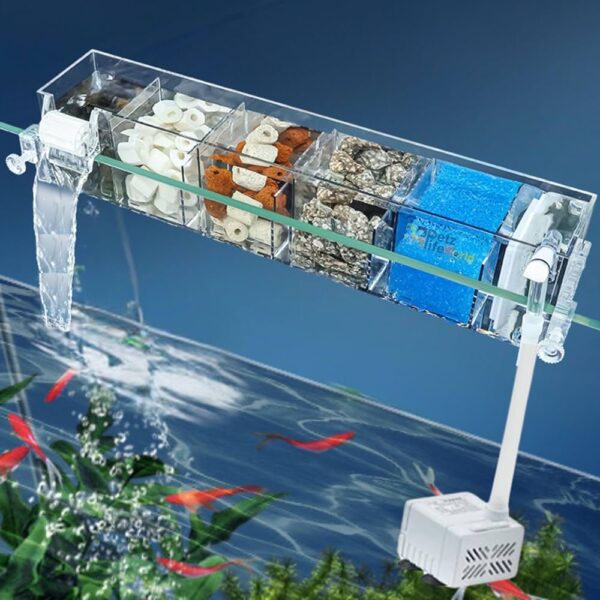 Upgrade your aquarium filtration with this top-hanging external sump filter, ideal for small and medium tanks up to 150L. Made from clear, durable acrylic, it’s easy to install, quiet in operation, and delivers efficient water flow using the included pump. Simply add your own filter media (ceramic rings, bio balls, sponge, or carbon) to create a customized multi-stage filtration system. Designed for freshwater, tropical, and planted tanks, this space-saving filter keeps your aquarium clean and healthy.